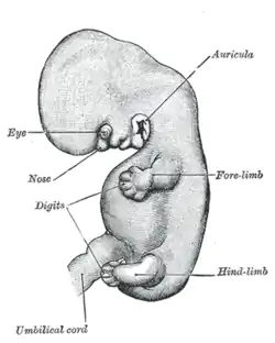 Around its second to third week, the developing embryo consists of three layers: ectoderm, mesoderm, and endoderm. The first part of the ear to develop is the inner ear,[19] which begins to form from the ectoderm around the embryo's 22nd day,[18] derived from two thickenings called otic placodes on either side of the head. Each otic placode recedes below the ectoderm, forms an otic pit and then an otic vesicle.[20] This entire mass is eventually surrounded by mesenchyme to form the bony labyrinth.[20][21]