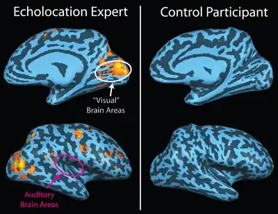 In a 2014 study by Thaler and colleagues,[9] the researchers first made recordings of the clicks and their very faint echoes using tiny microphones placed in the ears of the blind echolocators as they stood outside and tried to identify different objects such as a car, a flag pole, and a tree. The researchers then played the recorded sounds back to the echolocators while their brain activity was being measured using functional magnetic resonance imaging. Remarkably, when the echolocation recordings were played back to the blind experts, not only did they perceive the objects based on the echoes, but they also showed activity in those areas of their brain that normally process visual information in sighted people, primarily the primary visual cortex or V1. This result is surprising, as visual areas are normally only active during visual tasks. The brain areas that process auditory information were no more activated by sound recordings of outdoor scenes containing echoes than they were by sound recordings of outdoor scenes with the echoes removed. Importantly, when the same experiment was carried out with sighted people who did not echolocate, these individuals could not perceive the objects and there was no echo-related activity anywhere in the brain. This suggests that the cortex of blind echolocators is plastic and reorganizes such that primary visual cortex, rather than any auditory area, becomes involved in the computation of echolocation tasks.