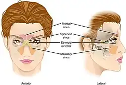 The mucosa that lines the nasal cavity extends into its chambers, the paranasal sinuses.[13] The nasal cavity and the paranasal sinuses are referred to as the sinonasal tract or sinonasal region, and its anatomy is recognised as being unique and complex.[30][31] Four paired paranasal sinuses – the frontal sinus, the sphenoid sinus, the ethmoid sinus and the maxillary sinus drain into regions of the nasal cavity. The sinuses are air-filled extensions of the nasal cavity into the cranial bones.[13] The frontal sinuses are located in the frontal bone; the sphenoidal sinuses in the sphenoid bone; the maxillary sinuses in the maxilla; and the ethmoidal sinuses in the ethmoid bone.[2][13]