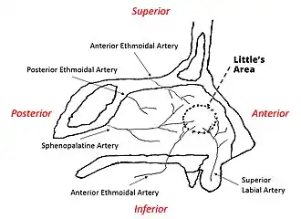 The sphenopalatine artery and the ethmoid arteries supply the outer walls of the nasal cavity. There is additional supply from a branch of the facial artery – the superior labial artery. The sphenopalantine artery is the artery primarily responsible for supplying the nasal mucosa.[3]