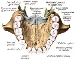 Roof of the mouth showing position of palatine bones making up the floor of the nose, and forming the posterior nasal spine for the attachment of the musculus uvulae.