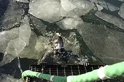 The diving reflex is a response to immersion that overrides the basic homeostatic reflexes, and which is found in all air-breathing vertebrates.[6][7] It optimizes respiration by preferentially distributing oxygen stores to the heart and brain which allows staying underwater for extended periods of time. It is exhibited strongly in aquatic mammals (seals,[18] otters, dolphins, muskrats),[19] but exists in other mammals, including humans. Diving birds, such as penguins, have a similar diving reflex.[6] The diving reflex is triggered specifically by chilling the face and breath-hold.[6][20] The most noticeable effects are on the cardiovascular system, which displays peripheral vasoconstriction, slowed pulse rate, redirection of blood to the vital organs to conserve oxygen, release of red blood cells stored in the spleen, and, in humans, heart rhythm irregularities.[6] Aquatic mammals have evolved physiological adaptations to conserve oxygen during submersion, but the apnea, bradycardia, and vasoconstriction are shared with terrestrial mammals as a neural response.[7]
