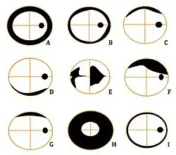 Figure 5 - Types of Visual Field Defects (right eye) A: Central scotoma B: Centrocaecal scotoma C: Nasal Step D: Superior Arcuate E: Nasal Wedge defect F: Superior Nasal quadrantanopia G: Superior Altitudinal H: Nasal hemianopia I: Enlarged Blind Spot with Paracentral scotoma located 15 degrees superiorly