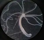 Hydramacin-1 was first isolated from epithelial cells of the cnidarian Hydra, a small (almost-microscopic) freshwater animal related to corals, sea anemones and jellyfish.[2][3][4][5] Like other members of the Phylum Cnidaria, Hydra possesses specialized defensive epithelial cells called cnidocytes that shoot toxic barbs into organisms they come in physical contact with. German researchers managed to isolate the gene that coded for the production of the protein from the Hydra genome in 2008. The gene was transferred and cloned in a plasmid (Pet32a) which was inserted in the bacteria Escherichia coli, a standard method of replicating a protein isolated from a much larger organism.[1] The three-dimensional structure of the resulting protein was then determined by NMR spectroscopy and is now published online by the Protein Data Bank.[6]
