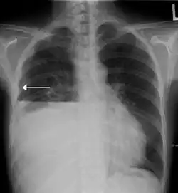 A hydropneumothorax with a white arrow pointing to the lung's pleura