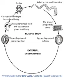 - ↑ "Hymenolepis Nana - Dwarf Tapeworm". www.parasitesinhumans.org. Archived from the original on 2023-09-07. Retrieved 2017-12-12.