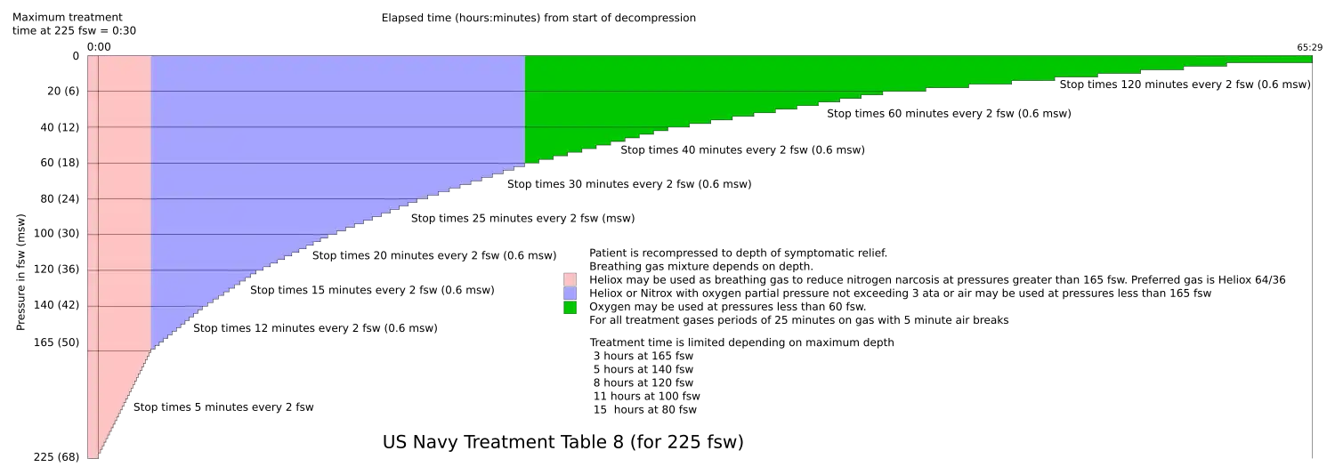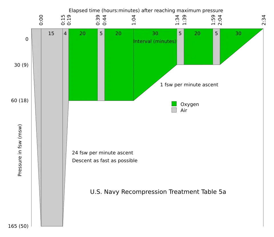 The initial portion of the treatment involves descent on air to the depth of relief plus 30 fsw or a maximum of 165 fsw for ten minutes. Ascent from initial treatment depth to 30 fsw occurs over 10 minutes. The diver then completes the treatment breathing oxygen and is followed by oxygen breathing on the surface for 30 minutes post treatment.