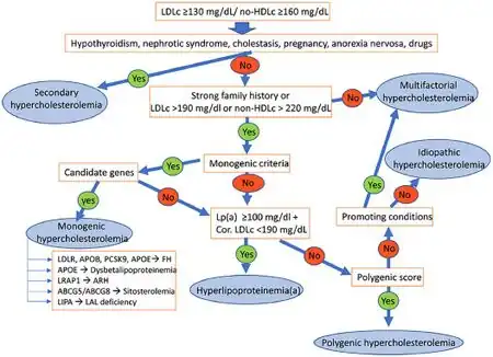 Causes may include genetic diseases such as familial hypercholesterolemia.[3] Most cases; however, are due to a combination of genetic factors together with diet, inactivity, obesity and smoking.[3][2] Other risk factors include low thyroid, nephrotic syndrome, cholestasis, alcoholism, diabetes, and certain medications like HCTZ.[3][1] Diagnosis is based on blood tests finding a high total cholesterol or LDL cholesterol.[6][1]
