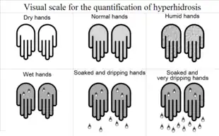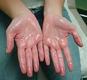 Hyperhidrosis is a condition of increased sweating, in excess of that required for regulation of body temperature.[1] The most commonly affected areas are the armpits, hands, feet, and face.[3] It may result in social embarrassment, the need to change clothing multiple times per day, and a decreased quality of life.[2]