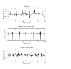 A healthy, neuropathic, and myopathic electromyogram, respectively.