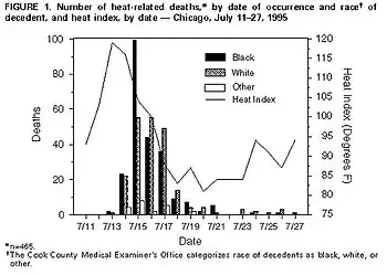 - ↑ Semenza JC, Rubin CH, Falter KH, Selanikio JD, Flanders WD, Howe HL, Wilhelm JL (July 1996). "Heat-related deaths during the July 1995 heat wave in Chicago". N Engl J Med. 335 (2): 84–90. doi:10.1056/NEJM199607113350203. PMID 8649494. Archived (PDF) from the original on 1 July 2023. Retrieved 15 May 2023.