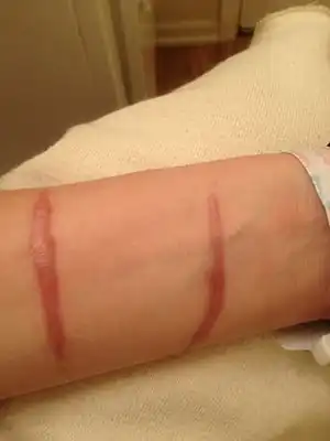 A hypertrophic scar is a cutaneous condition characterized by deposits of excessive amounts of collagen which gives rise to a raised scar, but not to the degree observed with keloids.[1] Like keloids, they form most often at the sites of pimples, body piercings, cuts and burns. They often contain nerves and blood vessels. They generally develop after thermal or traumatic injury that involves the deep layers of the dermis and express high levels of TGF-β.