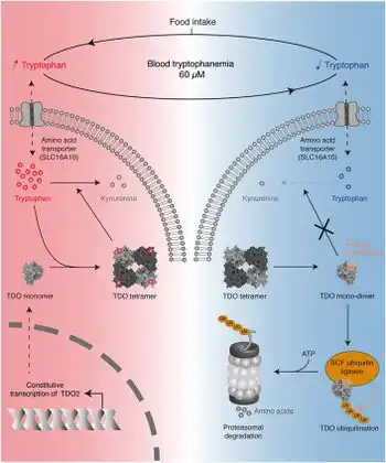 - ↑ Klaessens, Simon; Stroobant, Vincent; De Plaen, Etienne; Van den Eynde, Benoit J. (2022). "Systemic tryptophan homeostasis". Frontiers in Molecular Biosciences. 9: 897929. doi:10.3389/fmolb.2022.897929. ISSN 2296-889X. Retrieved 18 July 2023.