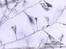 A hypha (from Ancient Greek ὑφή (huphḗ) 'web'; pl. hyphae) is a long, branching, filamentous structure of a fungus, oomycete, or actinobacterium.[1] In most fungi, hyphae are the main mode of vegetative growth, and are collectively called a mycelium.