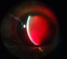 The person's vision may improve over time as the blood moves by gravity lower in the anterior chamber of the eye, between the iris and the cornea.[4] In many people, the vision will improve, however some may have other injuries related to trauma to the eye or complications related to the hyphema.[4] A microhyphema, where red blood cells are hanging in the anterior chamber of the eye, is less severe. A layered hyphema were fresh blood is seen lower in the anterior chamber is moderately severe. A full hyphema (total hyphema), when blood fills up the chamber completely, is the most severe.[4]