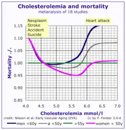 Demographic studies suggest that cholesterol levels form a U-shape curve when plotted against mortality; this suggests that low cholesterol is associated with increased mortality, mainly due to depression, cancer, hemorrhagic stroke, aortic dissection and respiratory diseases.[1] It is possible that whatever causes the low cholesterol level also causes mortality, and that the low cholesterol is simply a marker of poor health.[2]