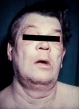 Man with myxedema or severe hypothyroidism showing an expressionless face, puffiness around the eyes and pallor