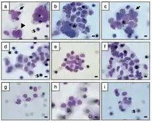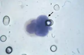 ![]() A circulating tumor cell (arrow) diagnosed by the ISET test. (The pores of the filter are also visible.) | |