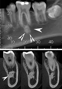 | Top: A hyperdense round lesion located under the apex of a non-infected tooth. Bottom: The lesion is separated from the root of the adjacent tooth by a visible periodontal membrane.[1] | |