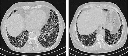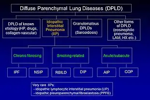 {{cite journal}}: CS1 maint: unflagged free DOI (link) - ↑ 6.00 6.01 6.02 6.03 6.04 6.05 6.06 6.07 6.08 6.09 Travis WD, Costabel U, Hansell DM, King TE, Lynch DA, Nicholson AG, et al. (September 2013). "An official American Thoracic Society/European Respiratory Society statement: Update of the international multidisciplinary classification of the idiopathic interstitial pneumonias". American Journal of Respiratory and Critical Care Medicine. 188 (6): 733–48. doi:10.1164/rccm.201308-1483ST. PMC 5803655. PMID 24032382.