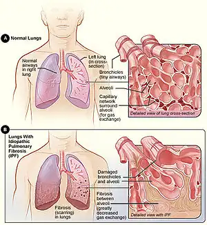 - ↑ 1.00 1.01 1.02 1.03 1.04 1.05 1.06 1.07 1.08 1.09 1.10 1.11 1.12 1.13 1.14 1.15 1.16 1.17 "Idiopathic Pulmonary Fibrosis". NHLBI. Archived from the original on 9 July 2021. Retrieved 21 January 2018.