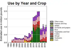 The estimated annual use of the compound in US agriculture is mapped by the US Geological Service and shows an increasing trend from its introduction in 1994 to 2014 when it reached 2,000,000 pounds (910,000 kg).[18] However, use from 2015 to 2019 dropped following concerns about the effect of neonicotinoid chemicals on pollinating insects.[19] In May 2019, the Environmental Protection Agency revoked approval for a number of products containing imidacloprid as part of a legal settlement, although some formulations continue to be available.[20][21]
