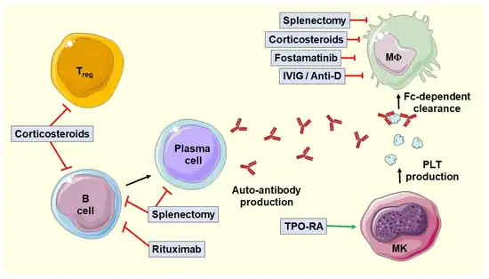 - ↑ 16.0 16.1 16.2 16.3 16.4 Cines DB, Bussel JB (2005). "How I treat idiopathic thrombocytopenic purpura (ITP)". Blood. 106 (7): 2244–51. doi:10.1182/blood-2004-12-4598. PMID 15941913.