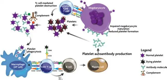 - ↑ Coopamah M, Garvey M, Freedman J, Semple J (2003). "Cellular immune mechanisms in autoimmune thrombocytopenic purpura: An update". Transfus Med Rev. 17 (1): 69–80. doi:10.1053/tmrv.2003.50004. PMID 12522773.