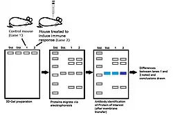 Two-dimensional gel electrophoresis (2-D gel) techniques in culmination with western blotting has been used for many years in the identification of immune response magnitude.[1] This can be accomplished by comparing various samples against molecular-weight size markers for qualitative analysis and against known amounts of protein standards for quantitative analysis.