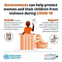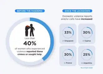 Amid the COVID-19 pandemic, many countries reported an increase in domestic violence and intimate partner violence.[1] United Nations Secretary-General António Guterres, noting the "horrifying global surge", called for a domestic violence "ceasefire".[2][3] UN Women stated that COVID-19 created "conditions for abuse that are ideal for abusers because it forced people into lockdown" thus causing a "shadow pandemic" that exacerbated preexisting issues with domestic violence globally.[4]