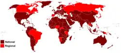 Countries where there were suspensions of Catholic Masses with the presence of the people during the COVID-19 pandemics, at regional level (in red) or national level (in burgundy)