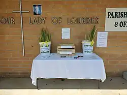 Due to masses being canceled, a table was set up with blessed palms, yellow ribbons, and prayer cards on Palm Sunday at Our Lady of Lourdes Catholic Church in Springfield, Tennessee.
