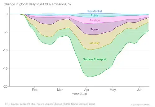 Due to the pandemic's impact on travel and industry, the planet as a whole experienced a decrease in air pollution.[32][33][34] A reduction in air pollution mitigated both climate change and COVID-19 risks, but it has not yet been established which types of air pollution, if any, are common risks to both.[35] The Centre for Research on Energy and Clean Air reported that methods to contain the spread of SARS-CoV-2, such as quarantines and travel bans, resulted in a 25% reduction of carbon emission in China.[36][37] In the first month of lockdowns, China produced approximately 200 million fewer metric tons of carbon dioxide than of the same period in 2019 due to a reduction in air traffic, oil refining, and coal consumption.[37] In this same period, car travel fell by 70% in the UK.[38] One Earth systems scientist estimated that this reduction may have saved at least 77,000 lives.[39] However, Sarah Ladislaw from the Center for Strategic & International Studies argued that reductions in emissions resulting from economic downturns should not be viewed as beneficial, because China's return to previous rates of growth amidst trade wars and supply chain disruptions in the energy market will worsen its environmental impact.[40] Additionally, Nature reported that in 2020, global carbon emissions only fell by 6.4%.[2]