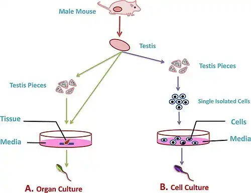 In fragment cultures, the testis is removed and fragments of tissue are cultured in supplemental media containing different growth factors to induce spermatogenesis and form functional gametes.[2] The development of this culture technique has taken place mainly with the use of animal models e.g. mice or rat testis tissue.