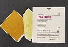 Inadine is an iodine-containing non-sticky surgical dressing consisting of a knitted viscose fabric with a polyethylene glycol base that contains and slowly releases the antiseptic povidone-iodine (PVP-1).[1][2] It is a topical wound dressing and is considered suitable for superficial wounds.[1][4] The rate of release of iodine is dependent on the amount of moisture from the wound.[2]