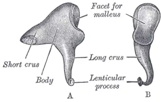 The incus is the second of three ossicles, very small bones in the middle ear which act to transmit sound. It is shaped like an anvil, and has a long and short crus extending from the body, which articulates with the malleus.[2]: 862 The short crus attaches to the posterior ligament of the incus. The long crus articulates with the stapes at the lenticular process.