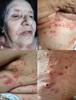 | Skin examination showing in A - disseminated nodular lesions over the face; B - over the trunk and the inframammary region; C - over the lateral face of the thorax; and D - over the back. | |
