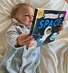 An infant holding a space-themed baby book