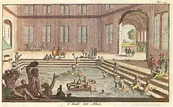 Great bathhouses were built in Byzantine centers such as Constantinople and Antioch,[12] and the popes allocated to the Romans bathing through diaconia, or private Lateran baths, or even a myriad of monastic bath houses functioning in the eighth and ninth centuries.[11] The Popes maintained baths in their residences which were described by scholar Paolo Squatriti as "luxurious baths", and bath houses including hot baths were incorporated into Christian Church buildings or those of monasteries, which were known as "charity baths" because they served both the clerics and needy poor people.[13] Public bathing was common in larger towns and cities such as Paris, Regensburg and Naples.[14][15] The Catholic religious orders of the Augustinians and Benedictines had rules for ritual purification,[16] and inspired by Benedict of Nursia encouraged the practice of therapeutic bathing; Benedictine monks played a role in the development and promotion of spas.[17] Protestantism also played a prominent role in the development of the British spas.[17]