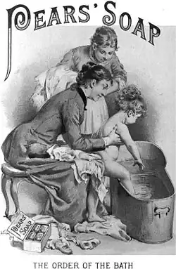 The industry of soapmaking began on a small scale in the 1780s, with the establishment of a soap manufactory at Tipton by James Keir and the marketing of high-quality, transparent soap in 1789 by Andrew Pears of London. In 1807, Pears found a way of removing the impurities and refining the base soap before adding the delicate perfume of garden flowers, founding Pears soap.[44] It was in the mid-19th century, though, that the large-scale consumption of soap by the middle classes, anxious to prove their social standing, drove forward the mass production and marketing of soap.