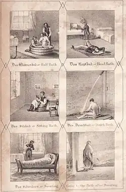 Public opinion about bathing began to shift in the middle and late 18th century, when writers argued that frequent bathing might lead to better health. Two English works on the medical uses of water were published in the 18th century that inaugurated the new fashion for therapeutic bathing. One of these was by Sir John Floyer, a physician of Lichfield, who, struck by the remedial use of certain springs by the neighbouring peasantry, investigated the history of cold bathing and published a book on the subject in 1702.[24] The book ran through six editions within a few years and the translation of this book into German was largely drawn upon by Dr J. S. Hahn of Silesia as the basis for his book called On the Healing Virtues of Cold Water, Inwardly and Outwardly Applied, as Proved by Experience, published in 1738.[25]