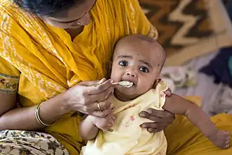 Infant feeding is the practice of feeding infants. Breast milk provides the best nutrition when compared to infant formula. Infants are usually introduced to solid foods at around four to six months of age.[1]