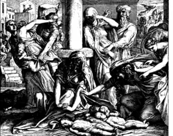 Infanticide is explicitly prohibited by the Qur'an.[73] "And do not kill your children for fear of poverty; We give them sustenance and yourselves too; surely to kill them is a great wrong."[74] Together with polytheism and homicide, infanticide is regarded as a grave sin (see 6:151 and 60:12).[68] Infanticide is also implicitly denounced in the story of Pharaoh's slaughter of the male children of Israelites (see 2:49; 7:127; 7:141; 14:6; 28:4; 40:25).[68]