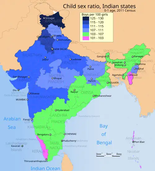 The child sex ratio is within the normal range in all eastern and southern states of India,[4] but significantly higher in certain western and particularly northwestern states such as Maharashtra, Haryana, Jammu and Kashmir (118, 120 and 116, as of 2011, respectively).[5][6] The child sex ratio noted in the western states of Maharashtra and Rajasthan in the 2011 census was 113, in Gujarat 112 and Uttar Pradesh 111.[7] The higher ratios in Maharashtra and Gujrat can also be attributed to an influx of male migration into the region.