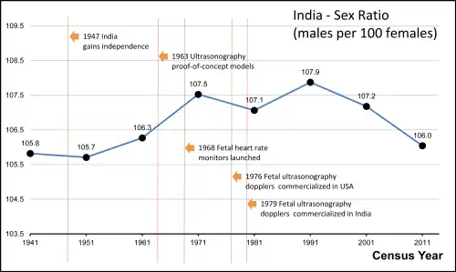Ultrasound technology arrived in China and India in 1979, but its expansion was slower in India. Ultrasound sex discernment technologies were first introduced in major cities of India in 1980s, its use expanded in India's urban regions in 1990s, and became widespread in 2000s.[17]