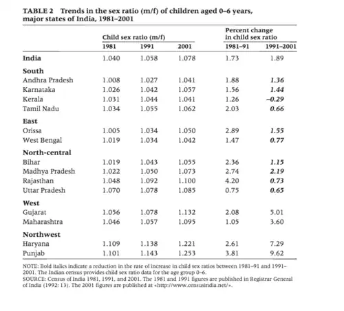 - ↑ Child Sex Ratio 2001 versus 2011 Census of India, Government of India (2013)