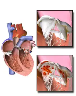 Infective endocarditis is an infection of the inner surface of the heart, usually the valves.[1] Symptoms may include fever, small areas of bleeding into the skin, heart murmur, feeling tired, and low red blood cell count.[1] Complications may include backward blood flow in the heart, the heart struggling to pump a sufficient amount of blood to meet the body's needs (heart failure), abnormal electrical conduction in the heart, stroke, and kidney failure.[1][2]