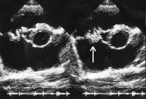 Vegetation on the tricuspid valve by echocardiography. Arrow denotes the vegetation.