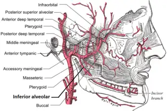 The inferior alveolar artery (inferior dental artery) is an artery of the head. It is a branch of (the first part of) the maxillary artery. It descends through the infratemporal fossa[1] as part of a neurovascular bundle with the inferior alveolar nerve and vein to the mandibular foramen where it enters and passes anteriorly inside the mandible, supplying the body of mandible and the dental pulp of the lower molar and premolar teeth.[2] Its terminal incisor branch supplies the rest of the lower teeth. Its mental branch exits the mandibula anteriorly through the mental foramen to supply adjacent lip and skin.[2]