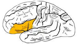 ![]() Lateral surface of left hemisphere viewed from the side. Inferior frontal gyrus shown in yellow. | |